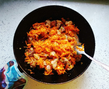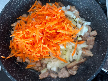 В сковороду к мясу добавьте лук и морковь. Все перемешайте и обжарьте все вместе еще 3-5 минут.