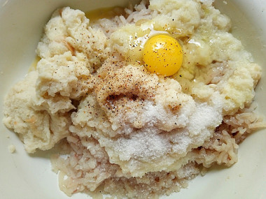 Выложите рыбный фарш в миску. Хлеб отожмите от молока и добавьте в фарш. Вбейте яйцо, влейте растопленное сливочное масло, всыпьте соль и перец. Если собираетесь добавлять в фарш лук, можете его мелко-мелко порубить, либо измельчить вместе с кусочками рыбы. Измельченный ножом лук можно добавить в фарш в сыром виде или предварительно обжарив на растительном масле до легкого золотистого цвета.
