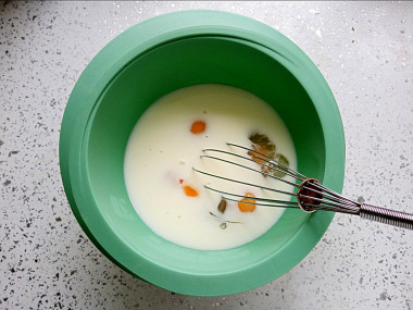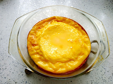 Учтите, что в процессе выпекания омлет подрастет примерно на 1/3 часть. Потому форма для выпекания должна быть с высокими бортами и небольшого диаметра. Перелейте в нее яичную смесь.