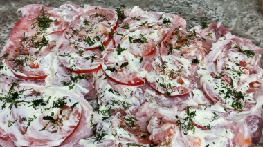 На отбивные добавила свежий томат, смазала майонезом. Сверху посыпала укропом, т.к. его очень люблю. Специи не добавляла, просто мелко порезала чеснок. Приготовила на мелкой тёрке, "шубку" из сыра.