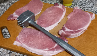 Для приготовления отбивных подготовьте необходимые ингредиенты. Свинину можно взять окорок или карбонат. Главное, чтобы удобно было нарезать на порционные куски для отбивания. Я буду использовать свиной окорок. Выбирайте мясо, которое не подвергалось замораживанию, иначе после разморозки из него уйдут все соки и отбивные будут получаться сухие.