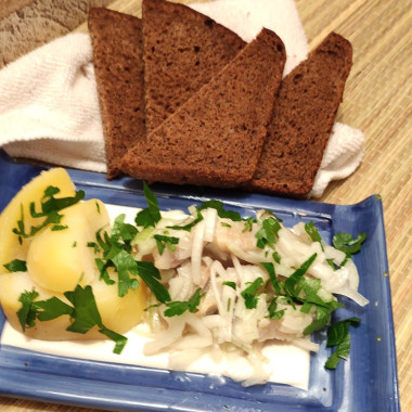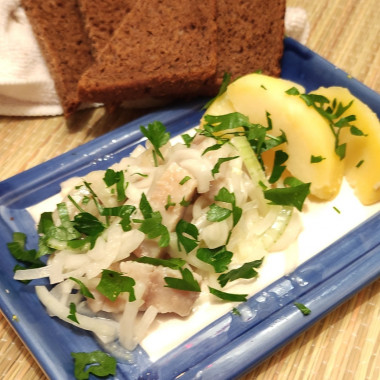Сельдь с луком и уксусом отлично сочетается с отварной картошкой и просто с черным хлебом.