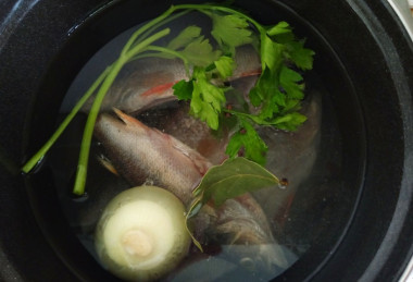 В момент закипания появится пенка, уберите её с помощью ложки. Бульон посолите по вкусу, плиту убавьте и варите рыбу около 15 минут.
