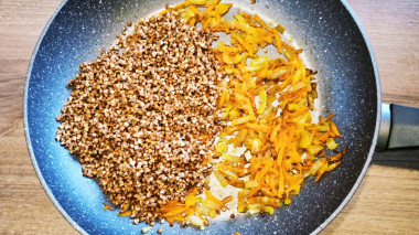 Гречку промойте несколько раз до чистой воды. Я обычно ополаскиваю её 2-3 раза. Отправьте крупу в сковороду с обжаренными овощами. Распределите ровным слоем и слегка посолите.