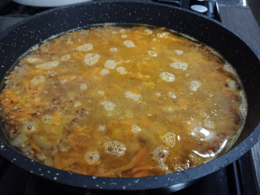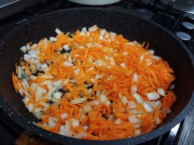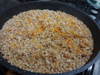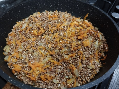 Разогрейте в сковороде растительное масло. Сковороду для приготовления гречки лучше использовать с толстым дном. Именно в ней овощи не пригорят. Отправьте лук и морковку обжариваться. На сильном огне, постоянно помешивая, обжарьте овощи до нужной степени. Их можно слегка пассировать до прозрачности лука, либо обжарить до золотистого оттенка. Я обжаривала около двух минут.
