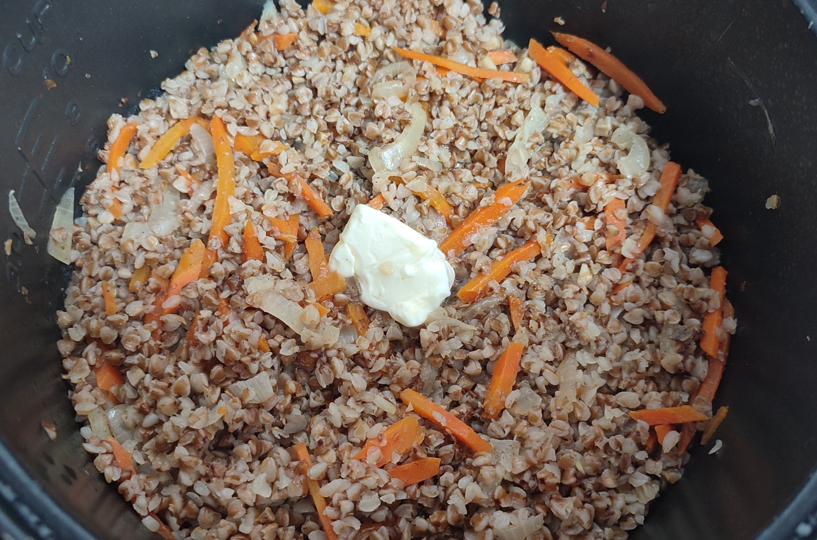 За это время крупа впитает воду и гречка дойдёт до полной готовности.Шаг 8: