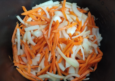 Разогрейте в сковороде растительное масло. Сковороду для приготовления гречки лучше использовать с толстым дном. Именно в ней овощи не пригорят. Отправьте лук и морковку обжариваться. На сильном огне, постоянно помешивая, обжарьте овощи до нужной степени. Их можно слегка пассировать до прозрачности лука, либо обжарить до золотистого оттенка. Я обжаривала около двух минут.Шаг 5: