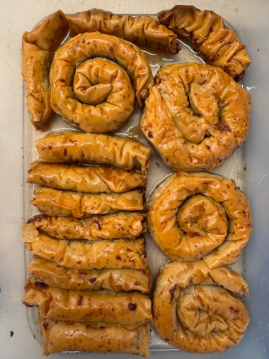 Так же по маслу, не добавляла растительное, сделала только на сливочном. Грецкий орех заменила на пекан. В процессе работы тесто фило не накрывала (это не рекомендация), я не разрезала лист теста на две части, делала целиковый и закручивала его в улитку, так было быстрее и лист просто не успевал подсыхать. С разрезанием листа пробовала, но для меня было слишком заморочно. Точно сделаю еще )