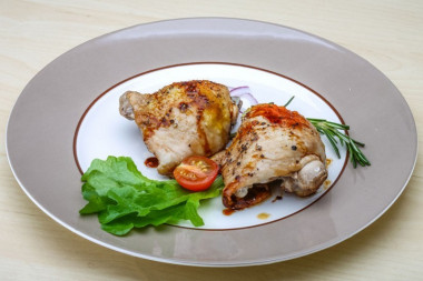 Предложите к куриным бёдрам различные соусы или свежие овощи. Прекрасно дополнят курицу соленья и салаты.