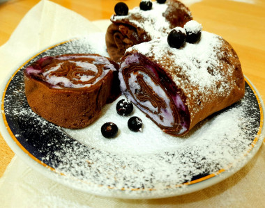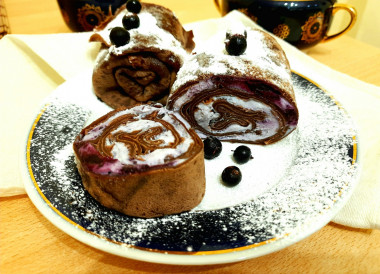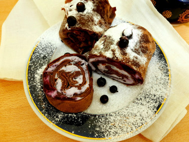 Меня давно привлёк этот рецептик рулетиков из шоколадных блинов с кремом. Во-первых, у нас в семье любят шоколадную выпечку, а во-вторых - понравилась очень интересная подача шоколадных блинов с творожным кремом. Блинчики приготовились достаточно быстро, никаких сложностей в приготовлении не возникло. Для начинки я взяла 250 грамм сыра Рикотта, сгущённое молоко и смородиновое желе. Блинов у меня получилось меньше, чем у автора, поэтому, когда формировала рулетики, то начинки ложила много, чтобы было вкусно. А было ОЧЕНЬ вкусно! Шоколадные блинчики прекрасно сочетались с нежной сладкой творожной начинкой, лёгкая кислинка смородины прекрасно дополнила это блюдо. Жемчужинка, огромное спасибо за этот вкусный рецептик симпатичных рулетиков. Оставила в КК, и буду готовить ещё. Вот мой фотоотчетик)))
