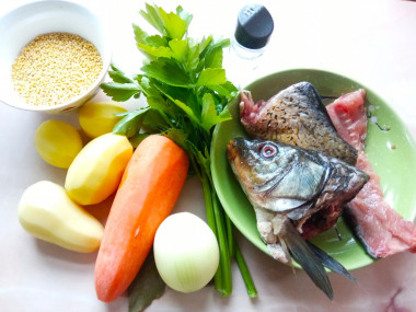 Сегодня готовлю уху из головы сазана. Филе я использовала для другого блюда, а хребет, хвостовая часть и голова пойдут на уху. Для варки бульона использовала листовой сельдерей вместе с черешками. Пшено хорошо промыла, залила кипятком на несколько минут и ещё раз промыла, чтобы не горчило и получше разварилось ( люблю разваристое пшено ) . Уха получилась наваристая, ароматная! Спасибо за рецепт, Мария!