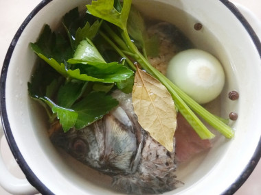 В кастрюлю выложите голову сазана, сельдерей, целую луковицу, лавровые листья, горошины душистого перца и соль. Залейте рыбу холодной водой и поставьте на медленный огонь. Доведите до кипения. Варите на медленном огне 20-30 минут, снимая пену. Голова должна хорошо вывариться и отдать бульону все свои соки.