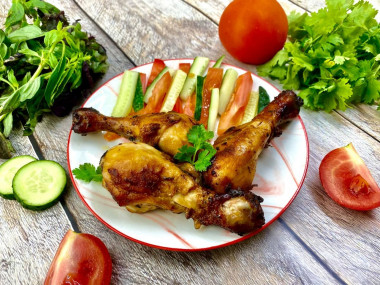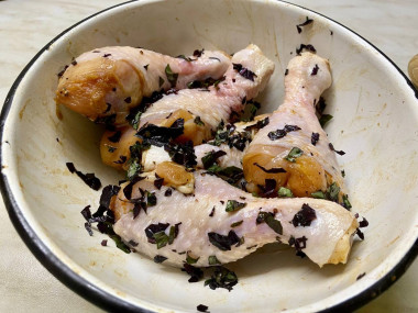 В получившийся маринад сложите куриные голени и обваляйте их, чтобы маринад покрыл их со всех сторон. Накройте чашу крышкой или пищевой пленкой и оставьте постоять 1 час при комнатной температуре. Если планируется готовка через несколько часов, то для маринования можно убрать курицу в холодильник.