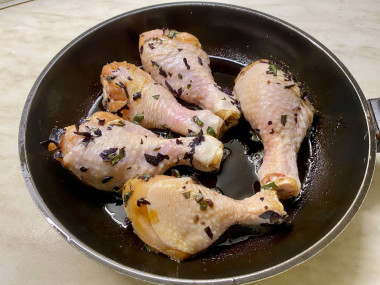Сковороду разогрейте до горячего состояния и налейте на неё немного растительного масла. Выложите в раскаленное масло куриные голени. Обжарьте их на сильном огне с двух сторон по паре минут. За это время на курице образуется корочка. Снаружи мясо, как бы, запечатается и будет сохранять все соки внутри куска.