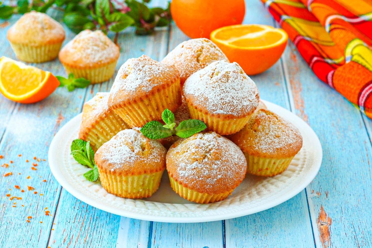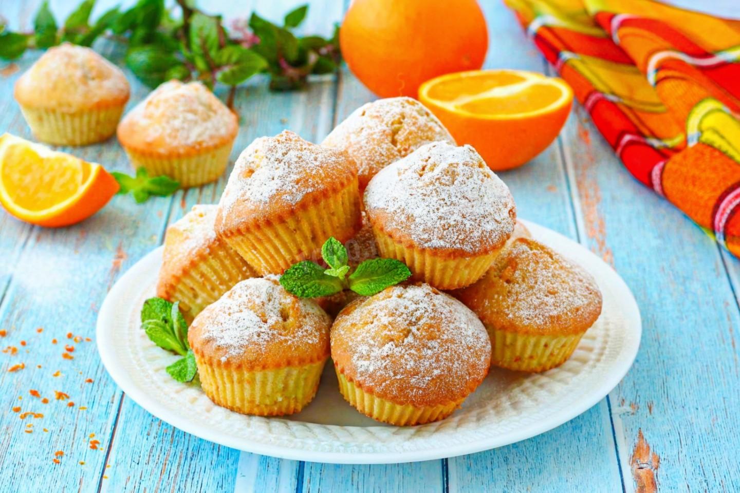 Апельсиновые кексы в духовке подают остывшими или чуть теплыми. Посыпьте сахарной пудрой перед подачей (через ситечко) — будет очень нарядно. Можно полить глазурью: смешать сахарную пудру с апельсиновым соком до консистенции густой сметаны и полить кексы. Украсьте долькой апельсина, свежими ягодами, мятой. Подавайте с чаем, кофе, какао или апельсиновым соком.