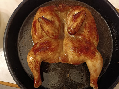 У меня была небольшая тушка курицы (1,2 кг). Чтобы курица быстрее приготовилась, разрезала по груди.