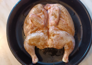 С помощью кисточки смажьте курицу маринадом внутри и снаружи. Оставьте мариноваться хотя бы на 30 минут, а лучше на 1 час. Переложите курицу в форму для запекания и снова смажьте маринадом. Немного маринада оставьте, чтобы в процессе смазывать птицу. Чтобы при запекании крылышки не пригорели, заверните их в фольгу.