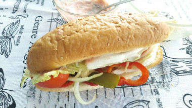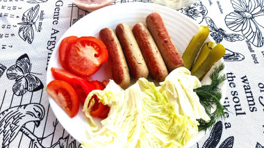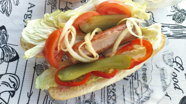 Увидела в магазине свежие, только что испеченные булочки для хотдогов и решила приготовить хот дог в домашних условиях в булочке с сосиской. Сосиски куриные обжарила слегка на сковороде, аромат непередаваемый! Приготовила соус - смешала кетчуп, майонез и горчицу. Майонез обязательно домашний, сама делаю, так вкуснее. Свежие овощи- салата у меня не было, я взяла пекинскую капусту, у нее тоже нежные, мягкие листья, кусочки помидора, маринованного огурчика, и колечки сладкого перца. Лук репчатый нарезала перьями и замариновала. Для этого к луку в отдельной посуде добавила по одной ложке сахара, соевого соуса и каплю уксуса, перемешала и оставила на 10 минут. Булочку смазываем соусом, кладем листья салата, на них- сосиску, дольки остальных овощей и посыпаем маринованным луком. Хотдог готов. В прямом смысле - пальчики оближешь!