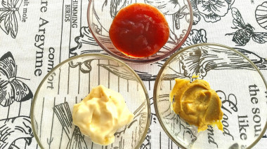 Полейте кетчупом и горчицей. Идеально для рецепта подойдёт кисло-сладкая горчица.