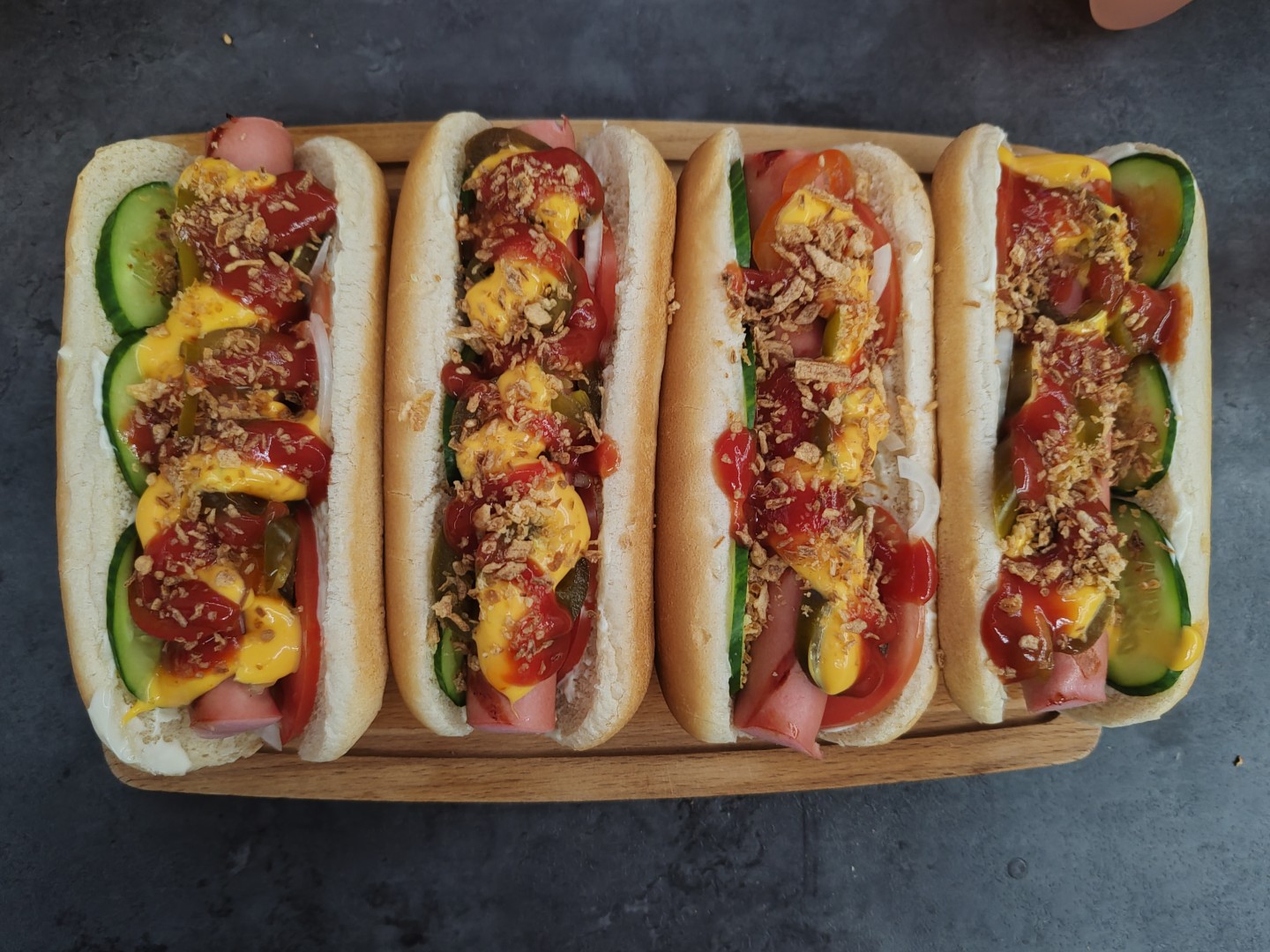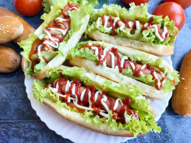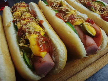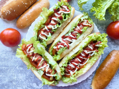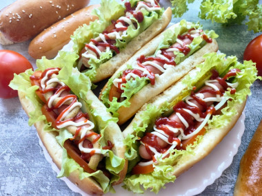Приготовила сегодня хот дог в домашних условиях в булочке с сосиской по вашему рецепту. Булочки выпекала сама. Сосиски взяла с сыром, отварила их. Уложила все ингредиенты как указано в рецепте. Сверху полила майонезом, кетчупом и горчицей. Подавала к столу тёплыми. Такая вкуснятина получилась!