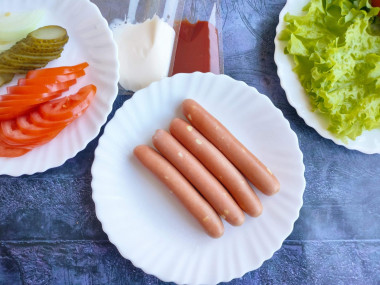 Как сделать хот доги в домашних условиях? Подготовьте все необходимые продукты. Булочки для хот догов можно испечь самим, а можно использовать готовые покупные. Я чаще для рецепта беру магазинные булочки. Сосиски по возможности возьмите домашнего производства или любые, которые вы чаще всего покупаете.