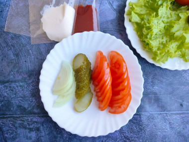 Далее в булочку уложите несколько колечек лука, кружочки огурца и помидора.