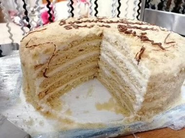 Делала на половину порции, нужен был небольшой тортик. Мед светлый, но при нагревании с сахаром и маслом получился красивый карамельный цвет теста. Соотношение ингредиентов точно по рецепту, но после остывания, тесто все равно осталось липким, и поэтому при распределении на пекарской бумаге обильно посыпала мукой и распределяла руками. Диаметр 20 см, получилось 5 коржей. Для крема взяла творожный сыр, сливки и сахарную пудру. Получился вкусный медовый торт!