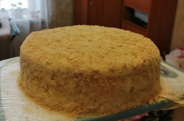 Такой торт пекли всегда дома. Только тесто делали погуще, пекли на сухой сковороде. Для облегчения задачи сейчас вместо формы для обрезания использую стеклянные крышки от кастрюль. Раскатываю не на пергаменте, а на силиконовой коврике для выпечки.