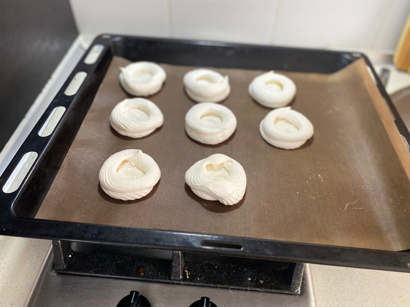 Взбила белки с сахаром и крахмалом до устойчивых пиков. С помощью кондитерского мешка отсадила корзиночки и запекала 10 минут на 140 градусах, и 40 минут на 100. Остывали безешки в духовке с открытой дверцей.