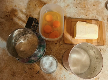 Пока крем остывает, приготовьте тесто. Подготовьте продукты для него. Яиц может уйти разное количество, от 3 до 5. Надо будет смотреть по консистенции теста. То же касается и муки.