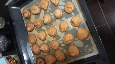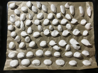 С помощью кондитерского мешка (или ложки), на подготовленный, застеленный бумагой для выпечки противень, выдавливайте наши будущие безешки. Я их делаю маленькими - на один укус, они и сушатся так быстрее и удобнее кушать.