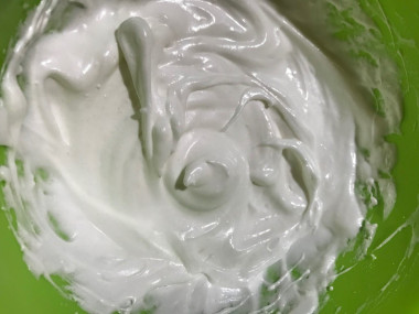 Все тщательно взбейте. Должна получится плотная стойкая и блестящая пена. Если миску с хорошо взбитыми белками перевернуть, ничего из нее не выпадет, а если вдруг смесь таки норовит покинуть миску, значит нужно еще немного взбить.