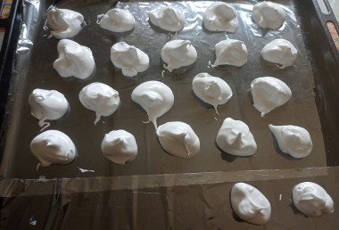 Кондитерского шприца у меня нет, поэтому формировала безе чайной ложкой. Выкладывала их на рукав для запекания (пергамент закончился).