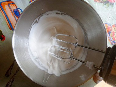 Очень аккуратно отделить белки от желтков. В белки не должно попасть ни капли желтков, иначе ничего не выйдет. Белки поместите в большую емкость, миска в которой будут взбиваться белки обязательно должна быть сухая и без капли жира на стенках, это важно! Белки взбейте миксером до мягкой, но уже стойкой пены, небольшими порциями добавьте сахарную пудру.