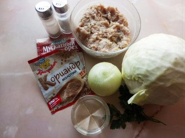Как сделать вареники с капустой и фаршем? В первую очередь подготовьте необходимые продукты со специями. Мясной фарш можете взять любой, по своему вкусу.