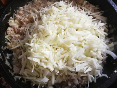 Нарежьте довольно тонкой соломкой порядка двухсот пятидесяти граммов белокочанной капусты и измельчив выкладывайте ее в общую сковороду, затем перемешивайте между собой все ингредиенты в сковороде и продолжайте обжаривать четыре-пять минут.