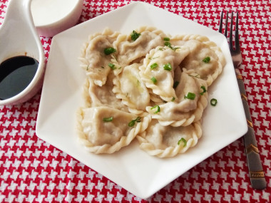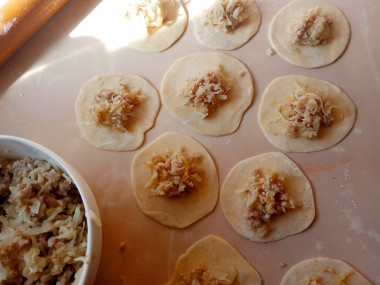 Для сытного ужина решила сделать вареники с капустой и фаршем. Мне нравится тесто на кипятке- с ним очень приятно работать- гладкое, эластичное, очень хорошо раскатывается и лепится. Для начинки взяла свиной фарш. Обжарила его на сковороде, добавила лук, затем мелко нарезанную капусту. В процессе приготовления добавляла на сковороду немного воды ( две- три столовые ложки), готовила начинку до выпаривания жидкости. Из специй использовала мускатный орех, молотый кориандр и черный молотый перец. Вареники получились вкусные, с сочной начинкой, тесто не разваривается. Подавала со сливочным маслом, сметаной и для любителей- с соевым соусом))). Спасибо автору за рецепт!