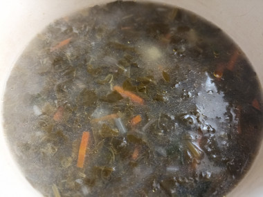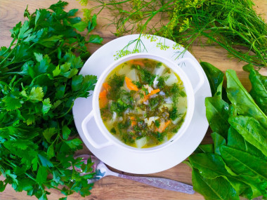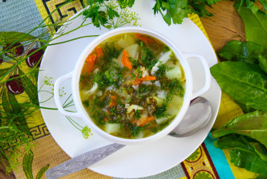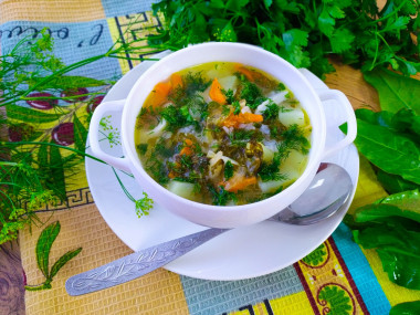 Приготовила суп щавелевый без мяса с яйцом и рисом на курином бульоне, из зелени дополнительно выбрала петрушку и укроп. С рисом суп действительно получился гораздо сытнее. Щавель у меня был свой домашний с огорода, сочный и с приятной кислинкой, он придал супу вкус летней свежести. Подавала к столу со сметаной, домочадцы остались очень довольны, спасибо за рецепт!