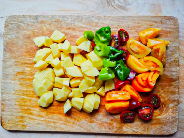 Помидоры нарежьте на крупные дольки. Можете также использовать маленькие черри помидоры.