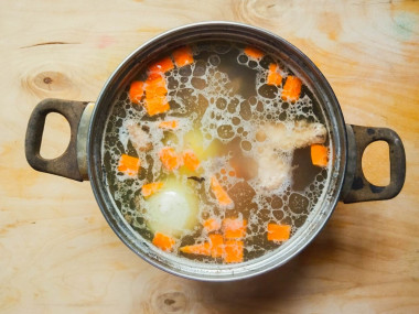 Нарезанную морковь и очищенную луковицу добавьте в кипящий бульон к утке. Туда же добавьте лавровый лист и специи: базилик, корень сельдерея и черный перец.