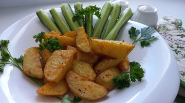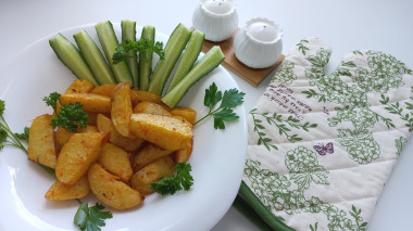 Когда картошка подрумянится, станет мягкой, доставайте противень из духовки. Переложите горячую картошку на блюдо и подавайте как самостоятельное блюдо или в качестве гарнира к мясу или рыбе. Если хотите, посыпьте ее сверху рубленой зеленью. Приятного аппетита!