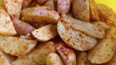 Клубни картофеля тщательно промойте и обсушите бумажными полотенцами. Нарежьте на 2-4 части в зависимости от размера и добавьте в миску к смеси специй и масла. Тщательно перемешайте. Приправьте картошку солью и перцем, вновь перемешайте.