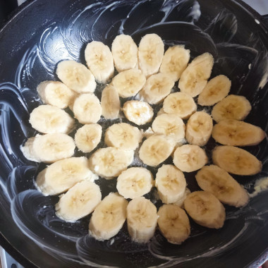 Бананы можете не выкладывать на дно сковороды, а нарезать небольшими кусочками и вмешать в тесто.
