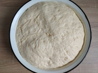 Вылейте в миску с тестом одну столовую ложку растительного масла и вымешивайте тесто еще две минуты, после чего прикройте миску полотенцем и поставьте ее на 1-1,5 часа в теплое место.