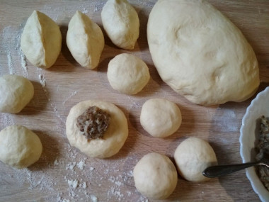 Разомните каждый колобок до лепешки необходимого размера и выложите на них порядка двух столовых ложек приготовленной начинки.