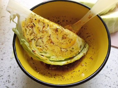 Подготовьте маринад. Количество всех компонентов в рецепте указано условно. Масла может понадобиться чуть больше или меньше в зависимости от размера кочана. Из сухих специй я использовала карри, чесночный порошок, сухие итальянские травы, молотые перцы и щепотку соли. Возьмите те специи, которые вам больше нравятся. Выжмите сок половины лимона. Тщательно перемешайте всё до однородности.