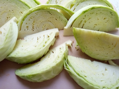 С капусты удалите внешние листы, они обычно жёсткие, иногда подсохшие или повреждённые. Кочан ополосните под проточной холодной водой и обязательно обсушите бумажными салфетками, чтобы убрать остатки воды. Нарежьте капусту дольками, кочерыжку удалять не нужно, иначе дольки распадутся.