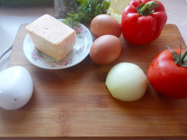 Как пожарить помидоры с сыром, луком и яйцом? Подготовьте продукты. Овощи помойте, лук очистите от шелухи. Зелень помойте и обсушите.