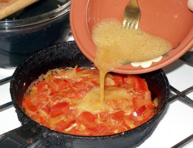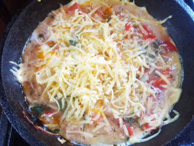 Яйца помойте и обсушите. Вбейте их в отдельную миску. Взболтайте вилкой, чтобы соединить белок с желтком. Вылейте яйца к овощам, равномерно распределите их по всей сковороде. Если вы не любите болтунью, то вбейте целые яйца сразу в сковороду, как на глазунью.