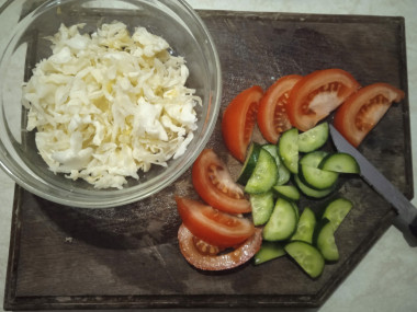 Как сделать салат из свежей капусты с огурцами и помидорами? Подготовьте для этого все необходимое. Огурцы и помидоры промойте в проточной воде от загрязнений. Затем их обсушите. Капусту можно использовать любую - свежую или хранившуюся с осени. Свежая мягче и сочнее. С кочана свежей капусты снимите 2-3 верхних обветренных листика.
